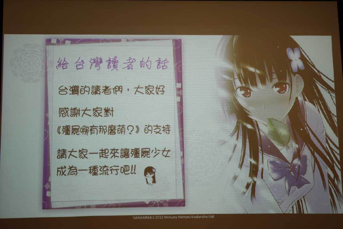 殭屍哪有那麼萌?(さんかれあ)》作者服部充的記者暨讀者見面會。在記者會結束後,於緊鄰國際會議中心的 2012 漫畫博覽會會場和台灣的讀者們見面,出席了《