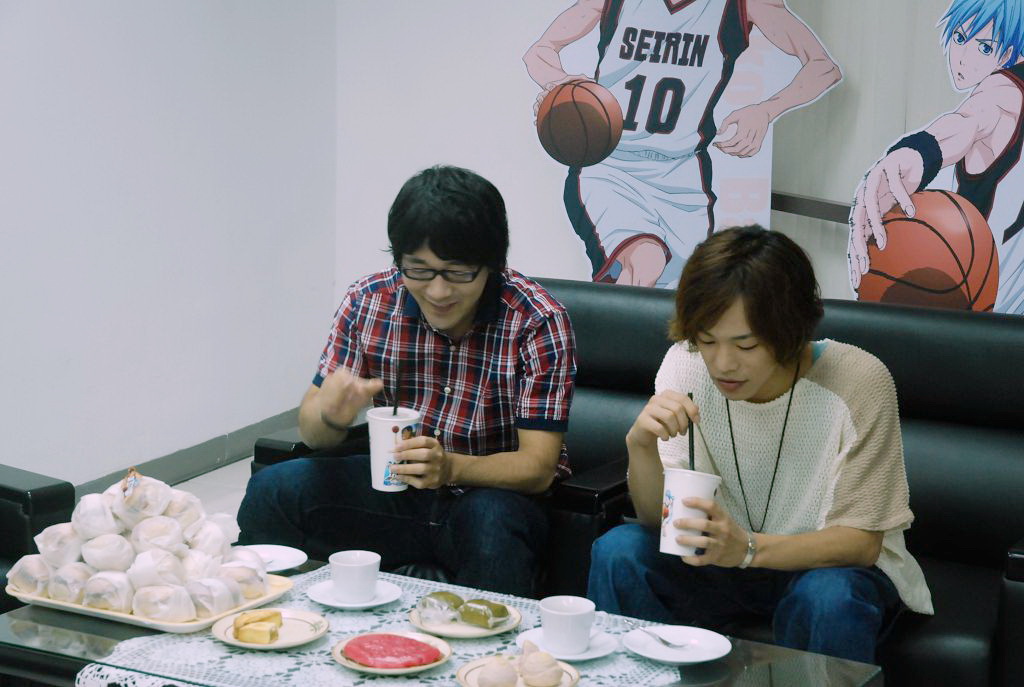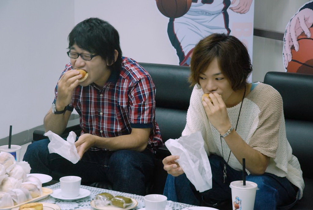 就在簽名會開始之前,兩位聲優也特別接受了包括巴哈姆特在內的少數媒體專訪。在專訪中,主辦單位也特別準備了台灣式的「奇蹟世代點心」給兩位聲優品嘗,包括了代表青峰的藍山咖啡、代表黃瀨的鳳梨酥、代表綠間的草仔粿、代表赤司的紅龜粿、以及代表紫原的芋頭酥。更另外準備了大量的一口漢堡代表火神、以及香蕉香草奶昔代表黑子,讓兩人一邊品嘗一邊大呼實在太好吃了。
