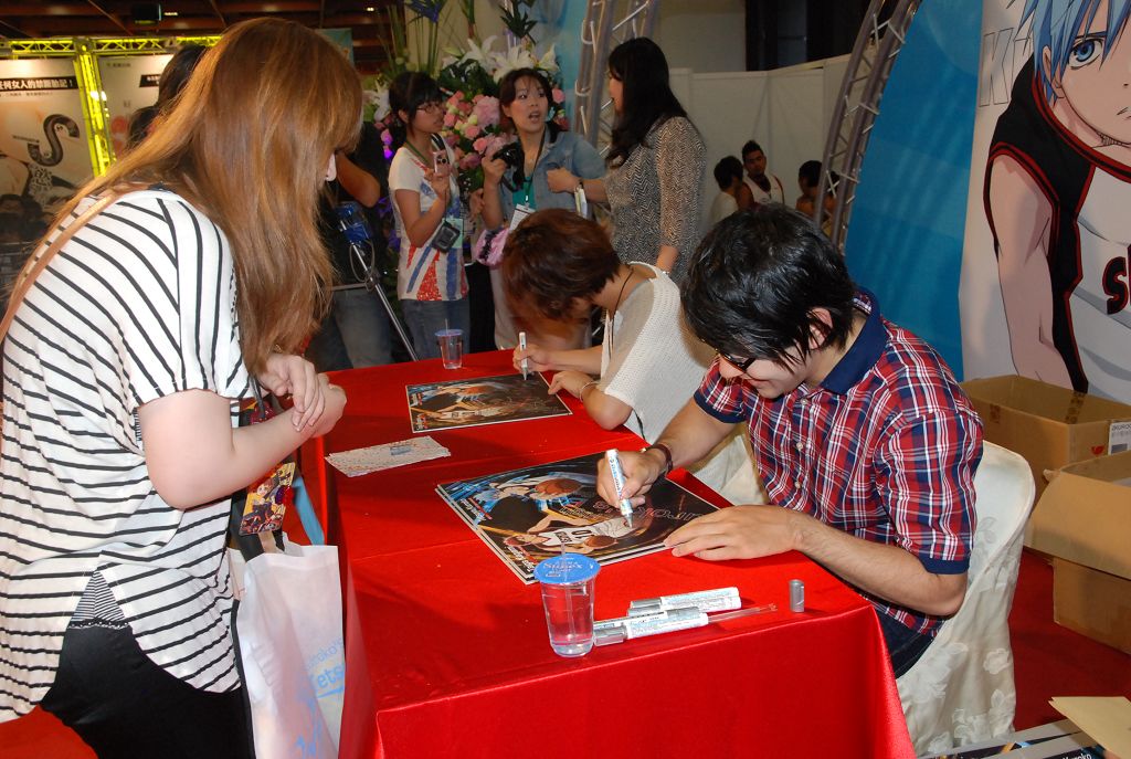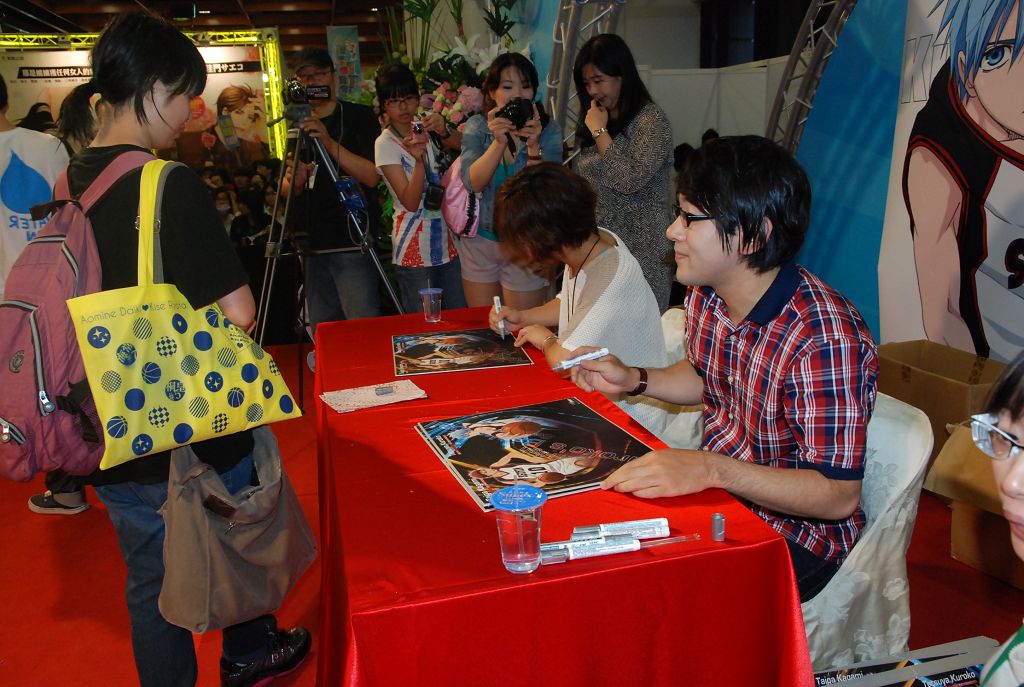 影子籃球員》,今年台灣也與日本同時期開始播映,而在今(12)日的漫畫博覽會中,群英社也特別邀請到為作品中的主角黑子與火神配音的兩位聲優:小野賢章與 小野友樹兩人共同來台舉辦簽名會活動。