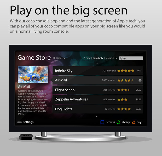 值得注意的是,若是家中有 Apple TV 的玩家,「The coco」也支援大螢幕輸出功能,讓玩家能夠有類似 WiiU 般的遊戲體驗。