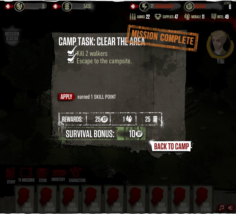 一般來說,主線任務除了等級需求之外,通常還有物資、士氣、以及情報三樣需求。物資可藉由支線任務進行收集,而士氣與情報則可透過與其他倖存者對話來獲得-畢竟身為領導者,藉由安撫等手段提升士氣也是很重要的。