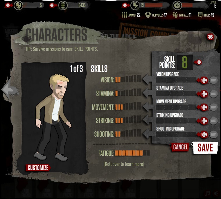 在完成任務可以獲得技能點數,玩家能夠自由分配於各屬性上,像是加強視力便可看得較遠、加強耐力可以承受較多的攻擊、加強行動能夠增加移動距離、而加強打擊與射擊能力則可分別增加近戰與遠程的攻擊力。玩家可以依造自己愛好的戰鬥風格來投資點數,除了主角之外,其他同伴的能力值也可以自由分配喔!