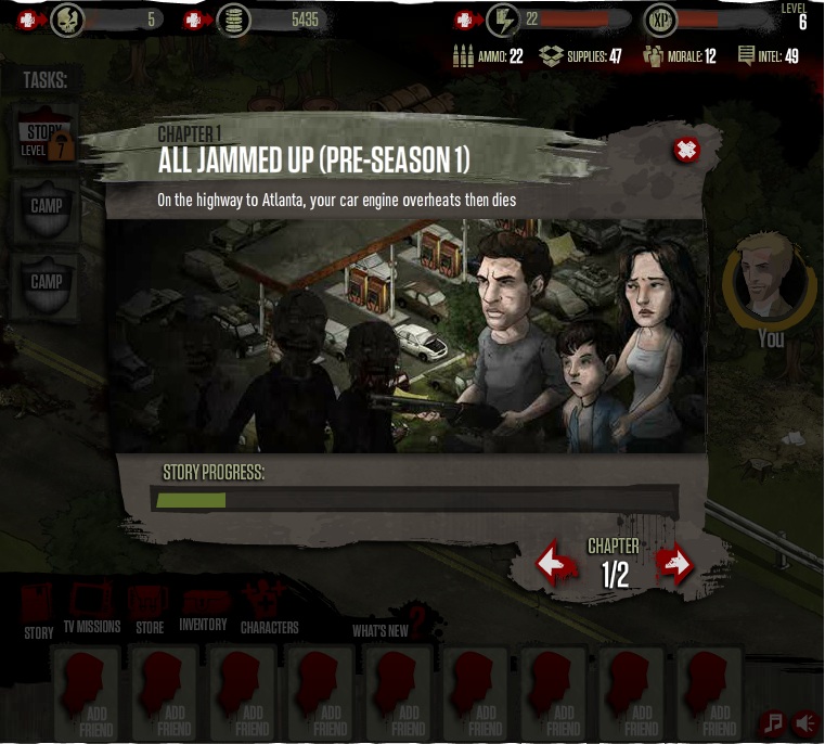 遊戲的劇情以章節來呈現,並以主線任務作為劇情進展的依據,當玩家完成主線任務時便可推動劇情,而在主線任務之間則會穿插一些支線劇情,通常是以收集物資或是清理環境(殭屍)為主,直到達成等級以及物資等條件,便可開啟下一個主線任務。