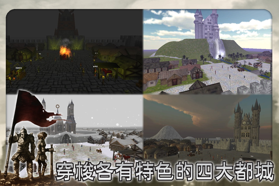 遊戲中的四大王國和超過 20 個城堡據點,各有其獨特地貌和必殺技能。穿梭四大都城,與不同的 RPG 角色交換戰鬥情報,無論是性感的舞者還是鬧事的醉漢,只要對話一 下,說不定就可以得到珍貴的戰爭情報。此外,玩家亦可以在都城內接新任務、招兵買馬、提升戰鬥力等。當升級成為騎士後,玩家更可選擇投靠一方陣營並效忠到底,選好最喜歡的一方,努力為國家奮戰。