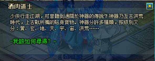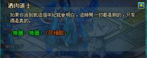 玩家角色等級超過 34 級後,可向 NPC 酒肉道士領取「神器任務」,可獲得體驗神器一個。