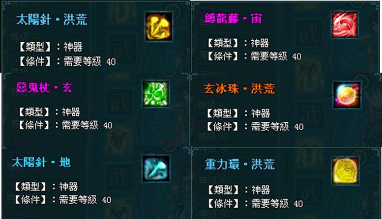 神器共分為 11 類,每纇又分為 7 個等級,以黃、玄、地、天、宇、宙、洪荒分別代表 1~7 級;如:玄冰珠•黃、玄冰珠•玄……等。隨著級別上升,神器技能的命中率和效果可獲得提升。裝備神器的角色,可獲得神器附帶的被動技能。