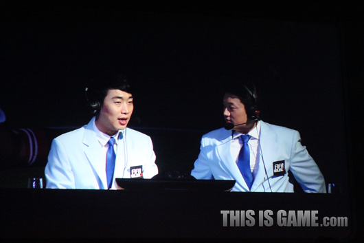 左起是負責轉播遊戲的廣播員成承憲與解說員朴文星