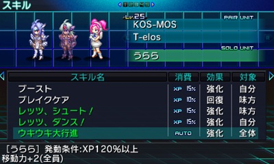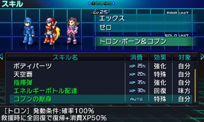 在地圖中開啟地圖選單,並選擇『技能』選項就可以使用。所謂『技能』分為兩種,一為玩家可以在任意時間點發動的技能,另一種叫做『自動技能(オートスキル)』,顧名思義會自動發動效果。另外,除了玩家單位以外,獨秀單位(ソロユニット)也會持有『技能』,與各種獨秀單位組合,就能使用各種不同的技能。