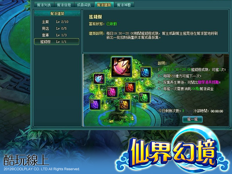 透過幫會成員每日幫派任務的達成,細心培養茁壯的搖錢樹,於每日晚間 19:30-20:00 期間,只要消耗 200 點幫派資金,即可與幫派成員一同攜手,每 5 分鐘採集金葫蘆一次,當日限定採集三次。開啟金葫蘆後,玩家將有機會獲得高級裝備兌換、升級材料。
