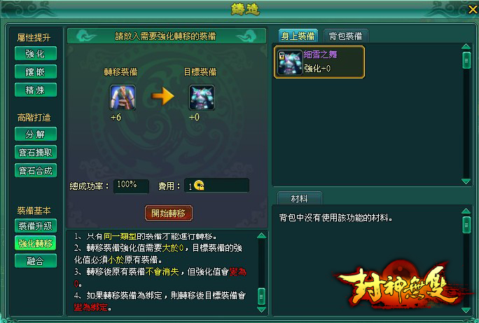 轉移裝備強化值需要大於 0,目標裝備的強化值必須小於原有裝備。