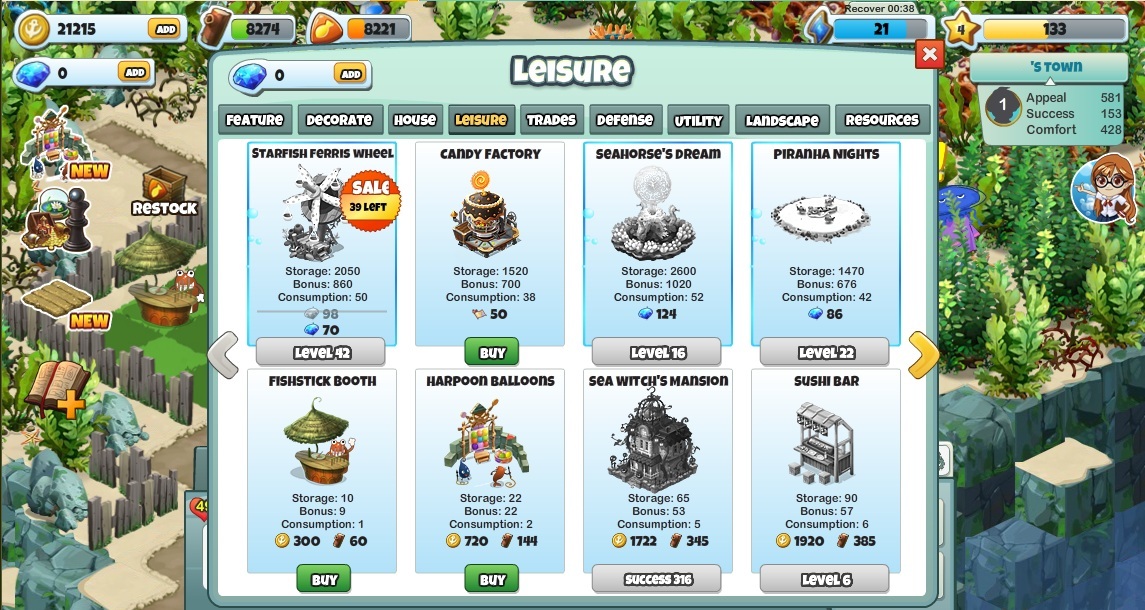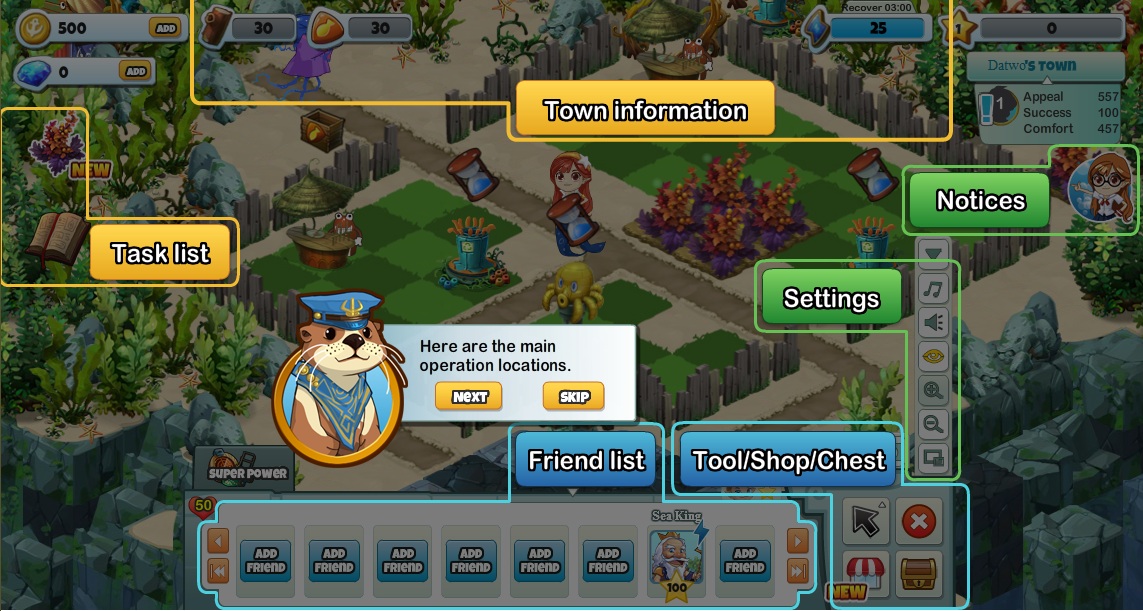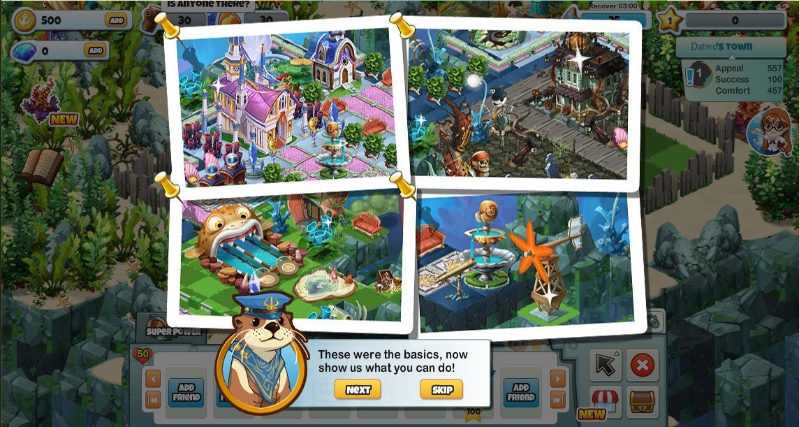等到環境清理得差不多,便可著手進行建設工程。在建設時,除了基本的房屋之外,也別忘了各式各樣的娛樂設施,不僅是因為這些娛樂設施與小鎮的發展息息相關,同時充滿樂趣的生活也能讓在地人與遊客都可以快樂的度過每一天。當然海中的生活也不是永遠都能維持和平,因此也別忘了建造防禦工事來抵擋怪物的來襲喔。