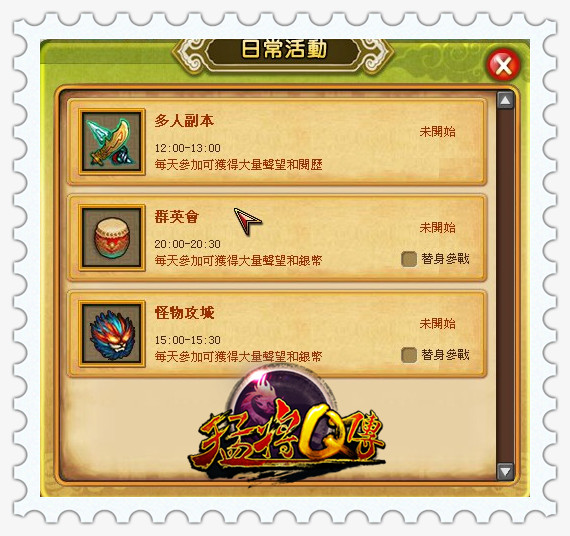 日常活動特設了匯總按鈕方便玩家尋找,在遊戲上方巡覽列中,玩家可以很輕鬆找到“日常活動”,點擊打開便可以看到我們每天可以爽快體驗的三個日常活動——多人副本,群英會以及怪物攻城啦!