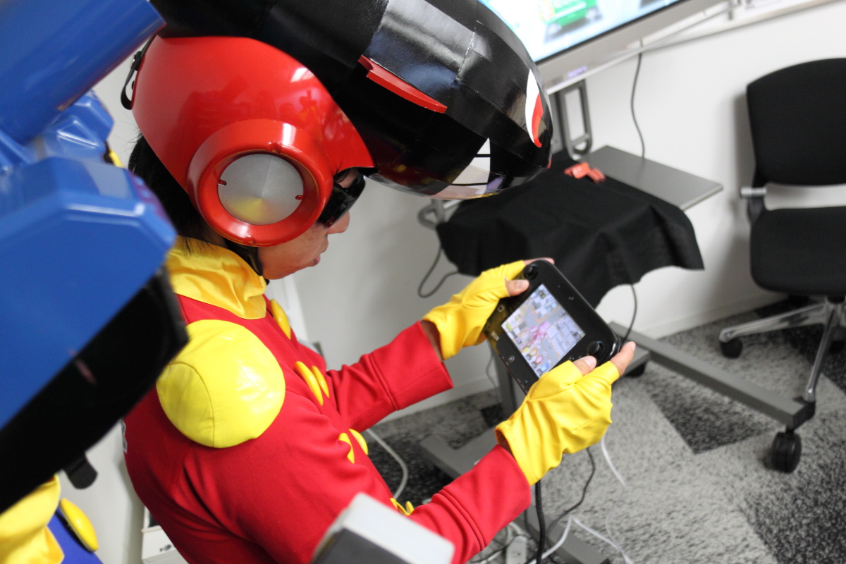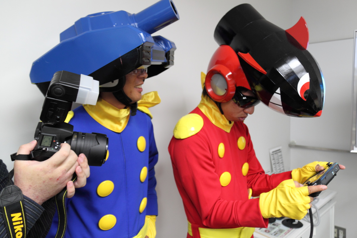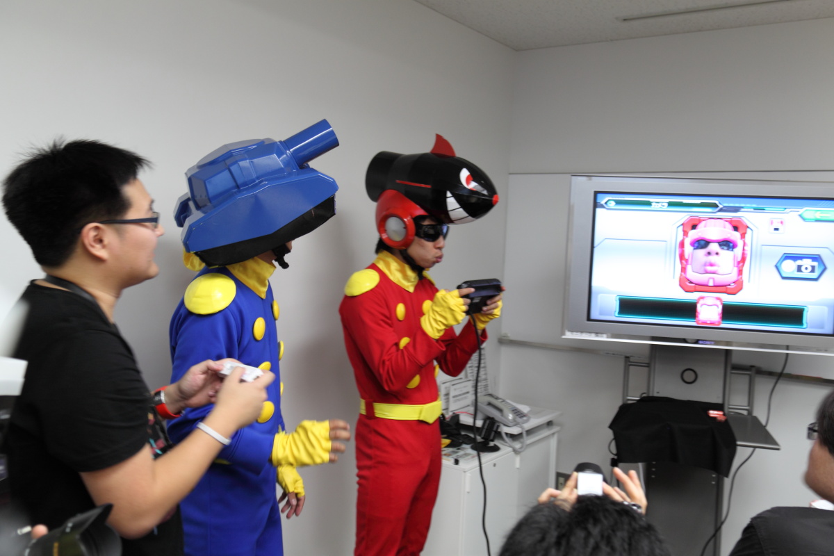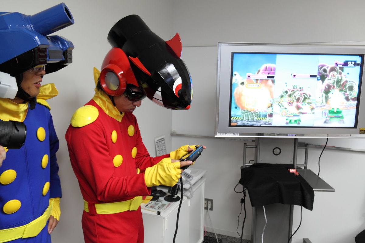現場也由將在新主機 Wii U 推出的趣味戰車遊戲《坦克大作戰》的小森製作人現身,身著趣味服裝來解說本作的概要。作風一向開朗活潑的 NAMCO BANDAI Games,該公司的遊戲製作人多多少少都有感染到開明的作風,在各大遊戲展中常常都會以 COSPLAY 登場來向玩家見面。而本次雖然是閉門的媒體展示會,也看到了活潑搞笑的小森製作人帶著他的助手,以一身英雄戰車裝來解說《坦克大作戰》。