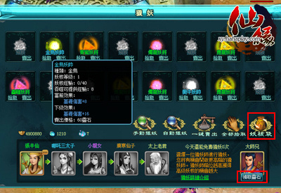 在獵妖介面的最下方,可以看見張半仙、哪咤三太子、小龍女、廣寒仙子、太上老君 5 位仙人,其捉妖能力也依次遞增。當玩家的元寶或靈石滿足一定數量,只需點擊手動或自動獵妖,每日即可隨機獲得妖核、殘核、混沌、妖核碎片。