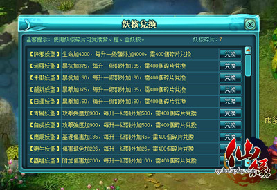 獵妖獲得的妖核全部收納在“妖核袋”之中,隨著等級的上升,玩家也將獲得更多妖核裝備槽,並將不同種類妖核裝備於身。其中,綠、藍、紫、橙品質的妖核,對應著妖將、妖帥、妖王、妖皇,其附加屬性也將依次升高。