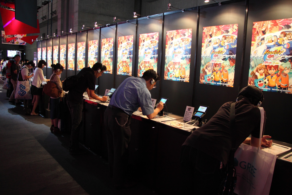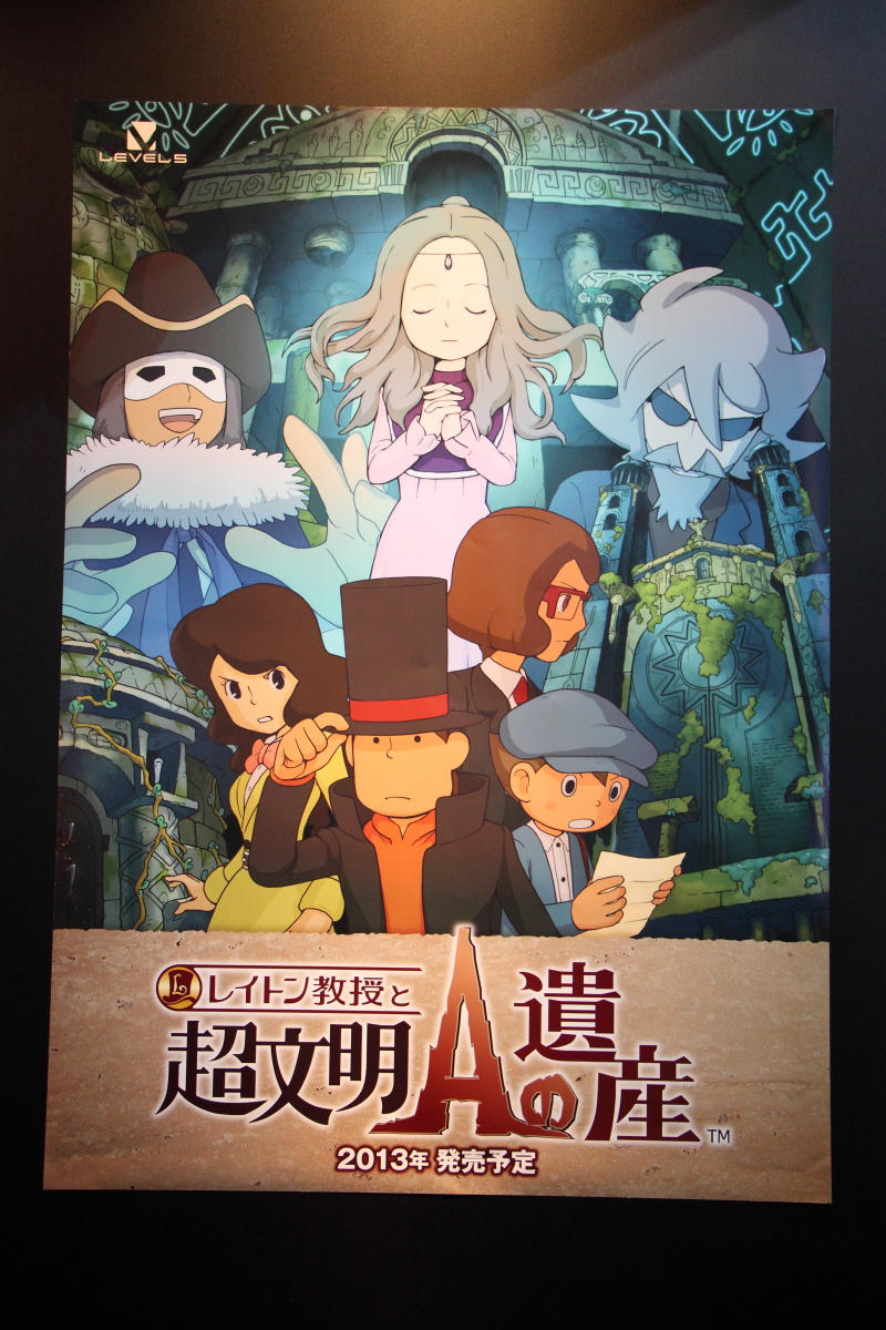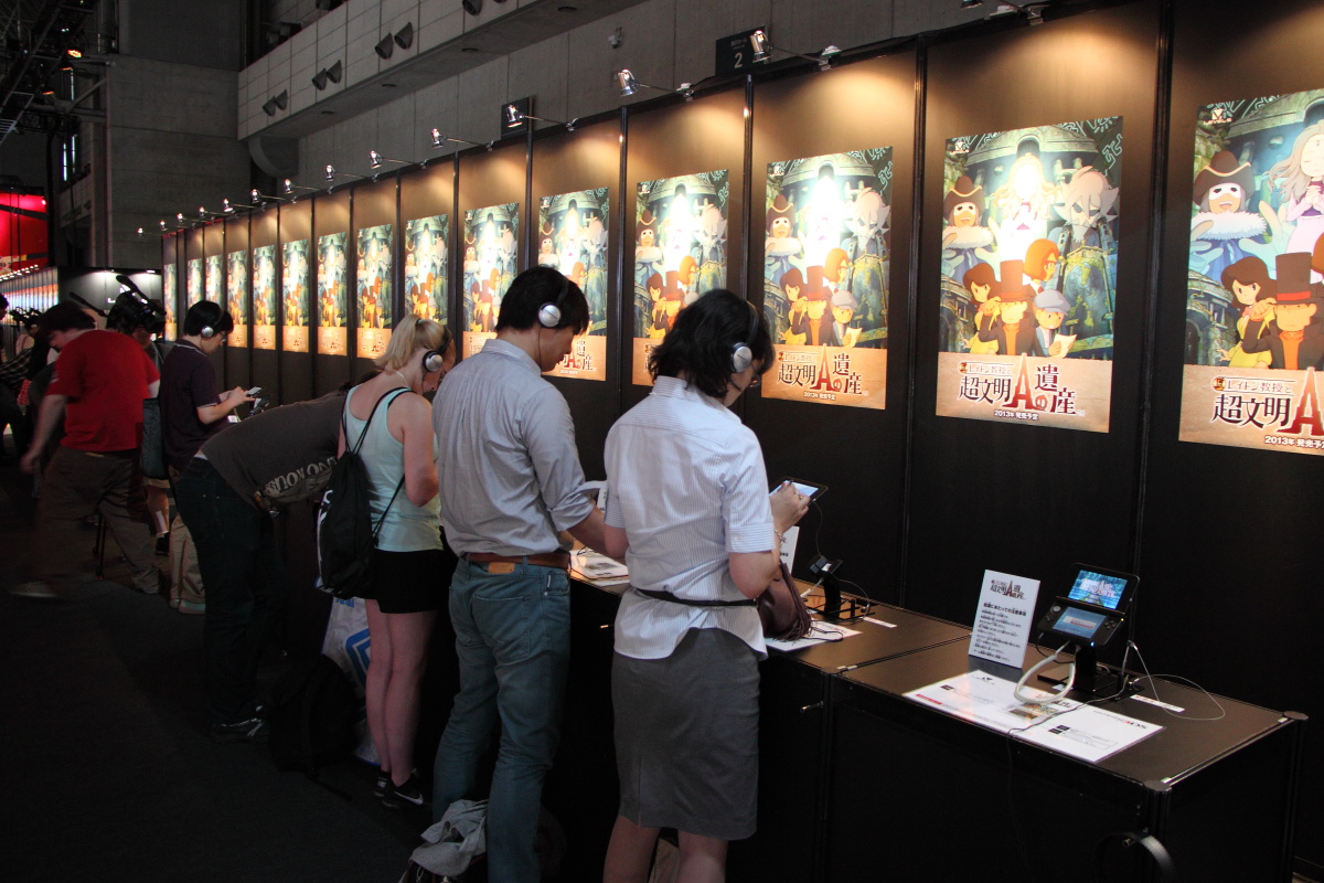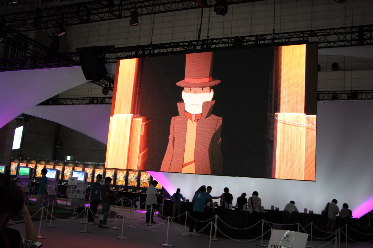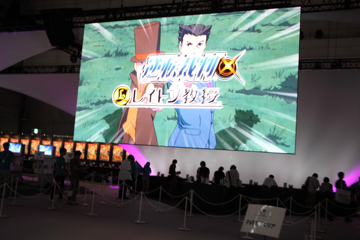 而十分受到矚目的異色跨界作品《雷頓教授 VS 逆轉裁判》除了在中央螢幕上映魄力影像之外,也在攤位右方擺出一個區域的試玩機台。此外,在左側則是擺出《閃電十一人 王牌前鋒 2013》的機台試玩。而在中央區塊也擺出了《紙箱戰機 W》的機台。