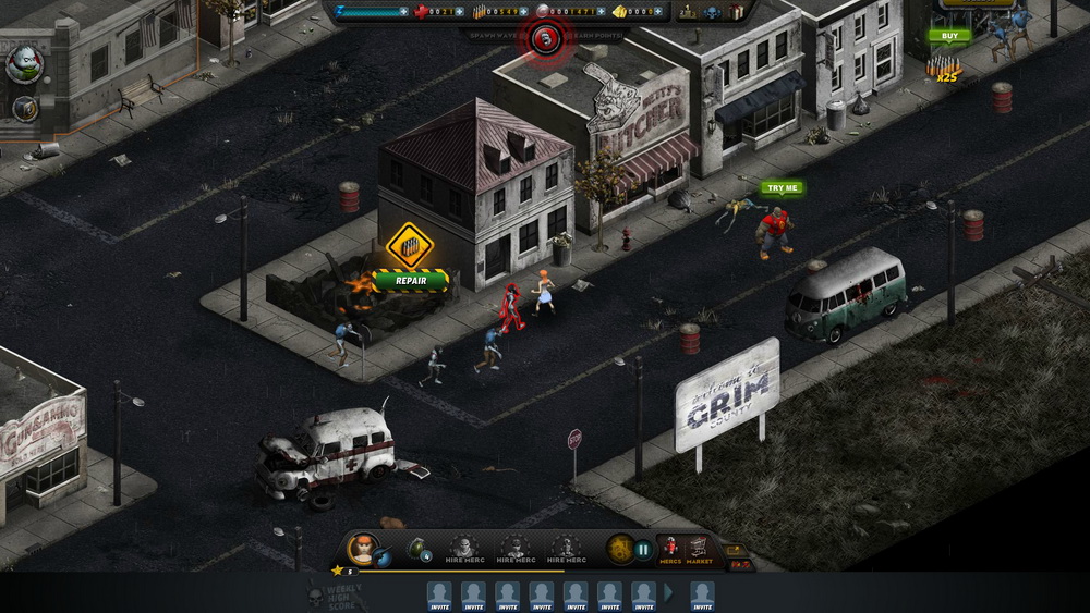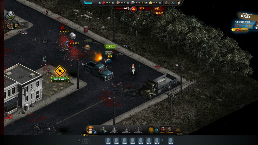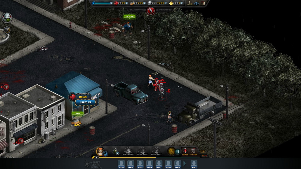 那麼,槍械要用的「子彈」從何而來呢?在小鎮中,除了原本就有的建築外,還有許多尚未使用的空地,玩家可以在空地上建造自己的補給設施,像是能夠生產彈藥的「彈藥工廠(Army Surplus)」、以及能夠製造醫療物資「藥局(Pharmacy)」等等,這些設施會定時產出物資,玩家只要定期過來收取即可輕鬆獲得補給。不過,需要特別注意的是-不知為何,殭屍除了對血淋淋的大腦有興趣外,他們對於你的建築物也很有興趣。若是你不在殭屍的視線中,他們就會跑去攻擊附近的設施,雖說設施損壞只需要花點錢維修即可,但是在維修時就無法獲得資源了。