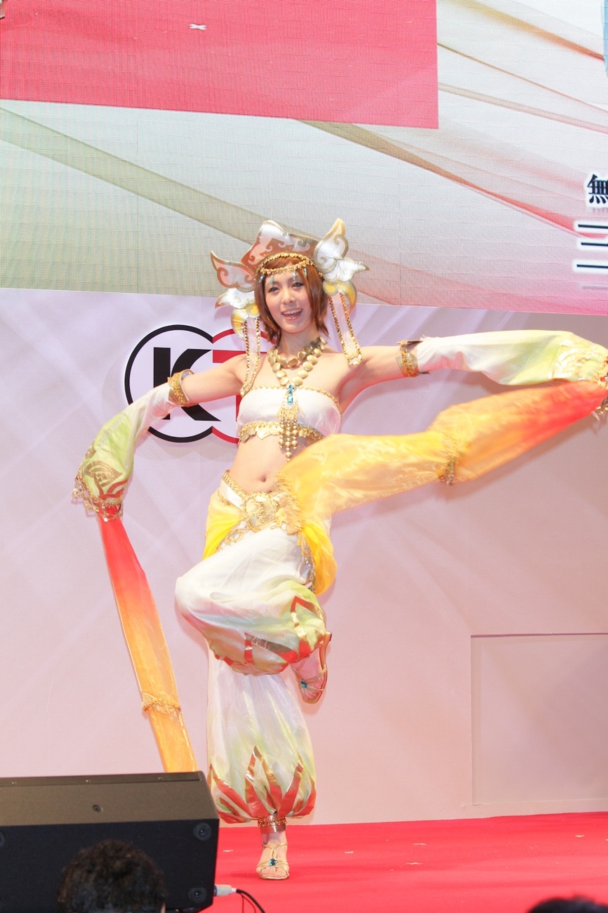 服裝的再現度很高,她並且表示製作方法是「自己編織絹絲來染色的」,讓會場發出讚嘆的聲音。山本小姐也說「從沒聽過有人自己編織」
