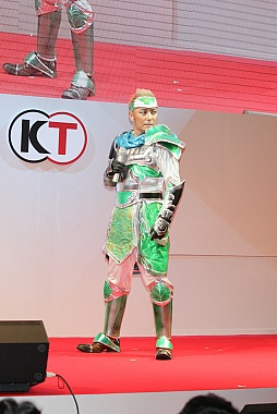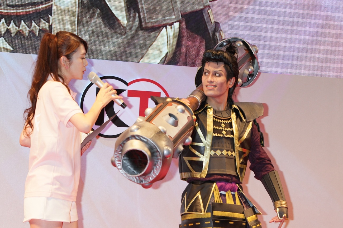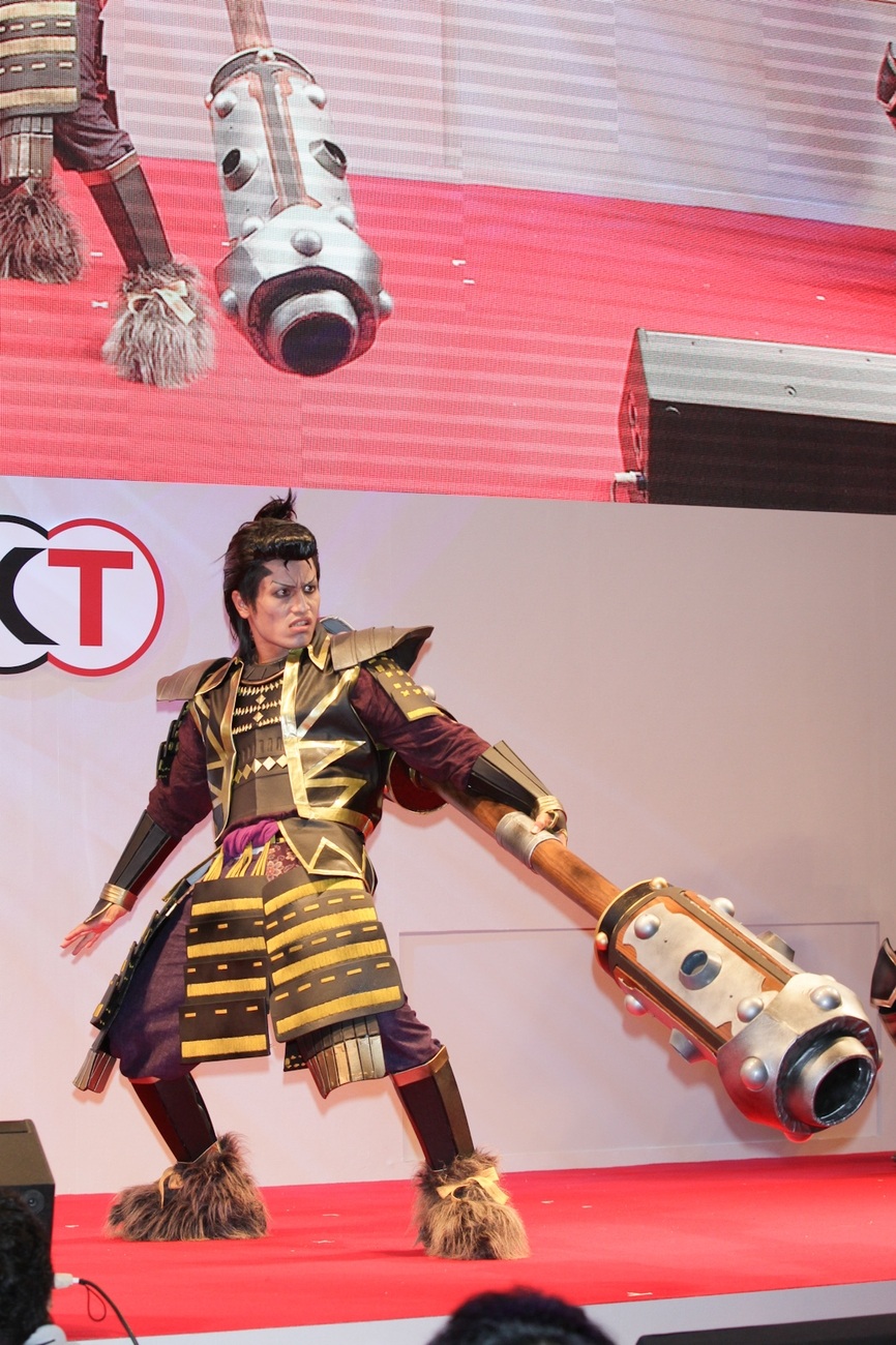 以挑釁的表情跟動作讓會場歡笑不斷。還耍流氓瞪著“生父”鯉沼先生,連周圍的人都來阻止他。服裝跟武器的素材幾乎都是紙,不過看起來質感非常的好