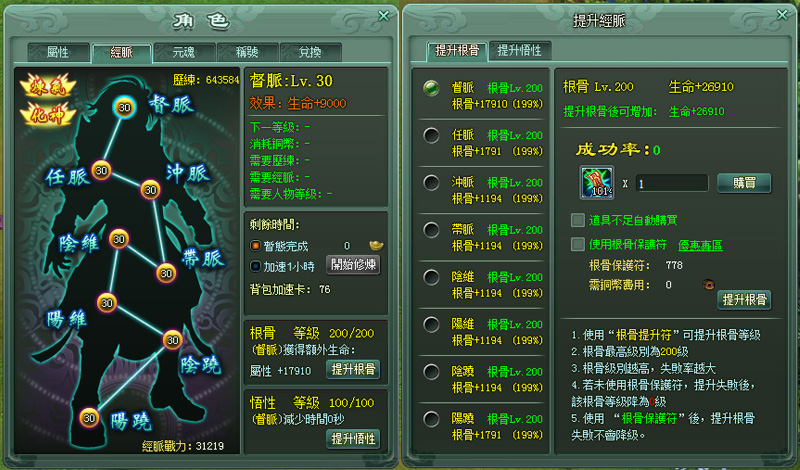 除了心法之外,經脈根骨也需暢通,此次改版開放根骨等級上限至 200 級,根骨達到 100 級後,若提升失敗將不會掉到 100 級以下。全新推出的「化神」功能,只要所有根骨達到特定等級,即可獲得全根骨屬性大幅加成喔!