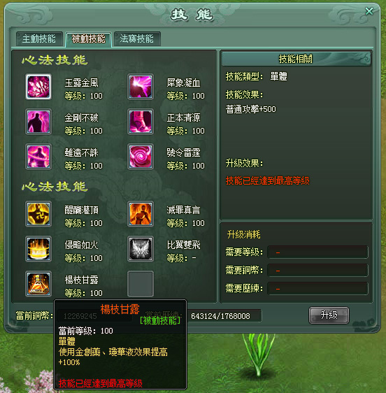無形無相,無窮無盡,語云:「手到形到,快不如心到意到。」提升角色能力境界,須從心法開始。全新 60 級的心法技能「楊枝甘露」,可增加金創藥和瓊華液的使用效果,等級越高效果越明顯,升級技能需要消耗歷練和銅幣,技能書可通過戰場榮譽商店換取獲得。