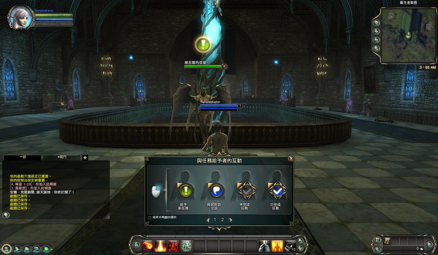 在承接任務的部分,區分得也相當直接簡單,一進遊戲眼前就有任務 NPC,頭上有綠色驚嘆號泡泡的 NPC 會給任務,而藍色打勾泡泡的 NPC 則代表任務達成,可以找 NPC 完成任務並領取獎賞,遊戲中預設 L 鍵可以檢視任務清單。