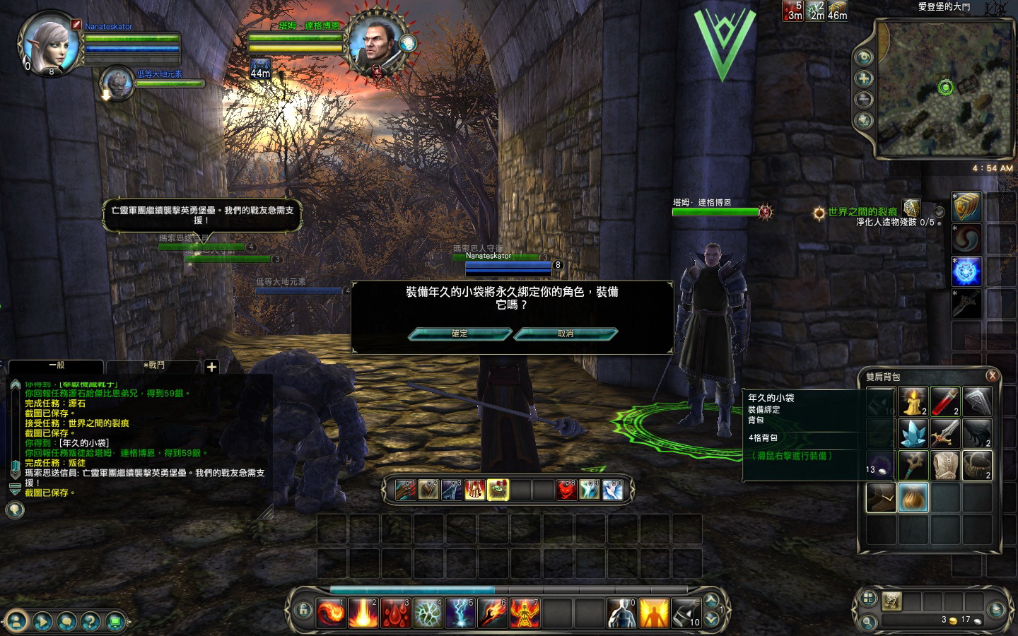 除了裝備品以外,也很重要的任務報酬就是包包行囊類的道具,進入遊戲初期,每個人身上都有一個 20 格包,另外還有 4 個包包欄位,在包包上按右鍵就會綁定使用,之後玩家可以自行擴充包包,十分方便,任務物品不會佔據包包格數,玩家不用擔心任務太多,身上格子不夠用!