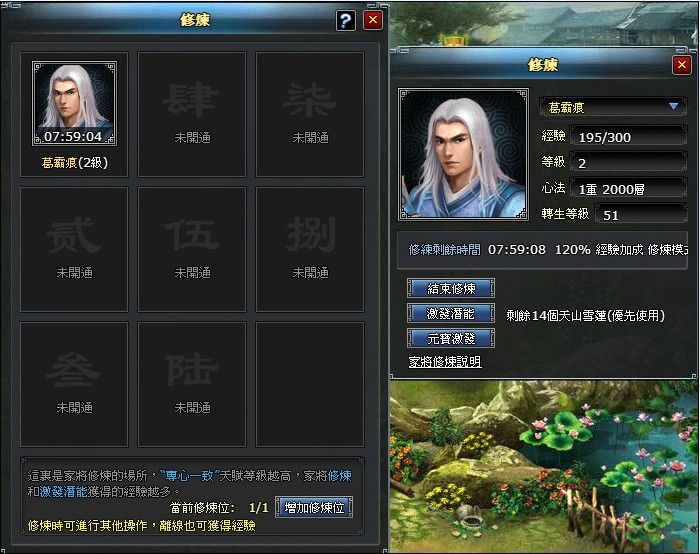 在遊戲中,家將的成長並非以傳統的打怪升級,而是採取了修煉增加經驗方式,唯有領略武功的真締,才能夠提高實力,達到更高的層次。玩家也可以利用戰鬥獲得的修為或天山雪蓮,為家將激發潛能,大大縮短提升等級的時間。「天山雪蓮」是否一株難求?不!玩家只要每日在線達到指定時間就能獲得,讓家將成俠之路變得更加輕鬆!