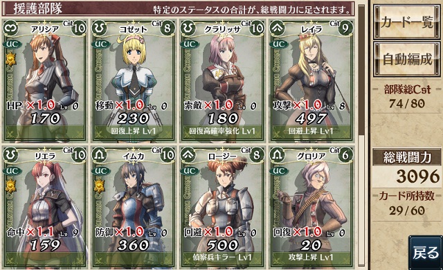 部隊的規模受限於「CST」值的大小,數值越大就能將戰闘力越高的人物放進部隊裡。