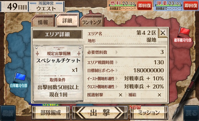 戰況地圖(戦況マップ)裡可以看到由 50 個區域所構成的戰場,東西同盟各有總司令部,必須步步進逼,將通往總司令部的區域(エリア)一一佔領,直到被我方佔領的區域鄰接敵方總司令部,當攻陷敵方總司令部,就能取得這場大戰的勝利,勝利一方將獲得優渥的獎勵。