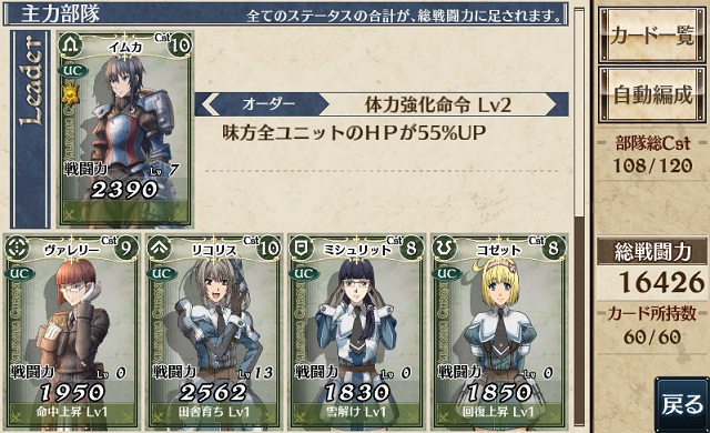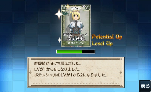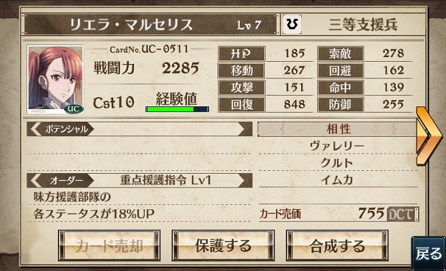 利用設施「昇格試験場」裡的卡片合成(カード合成)功能,可提升卡片等級,若合成有相同特技如命令(オーダー)或潛力(ポテンシャル)的卡片,也能提升特技等級。