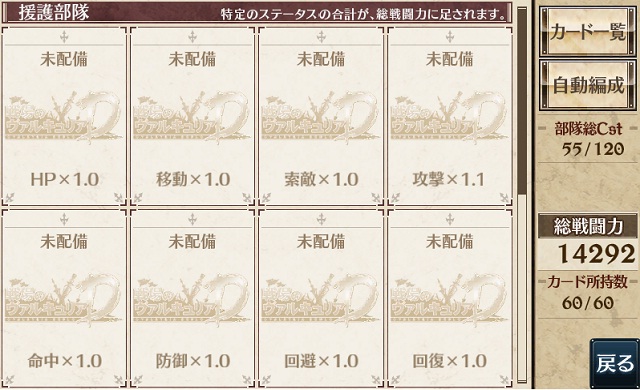 打仗靠部隊,部隊要靠人物卡片(カード),卡片中有幾項重要指標如兵種、稀有度(レア)、CST 值、卡片等級、戰闘力、能力值、特技、投緣對象等。簡單而言,要提高部隊的總戰闘力,要在有限的 CST 值內,將戰闘力最高的卡片放入主力部隊,再將專精某項能力的卡片放入對應的援護部隊內,再根據隊長命令(オーダー)、投緣人物、兵種及能力等要素,調整合適的隊員。