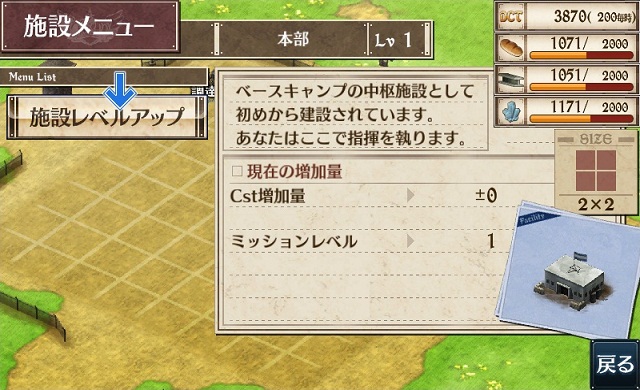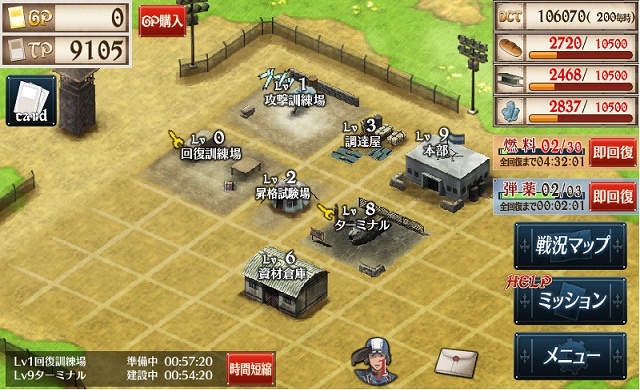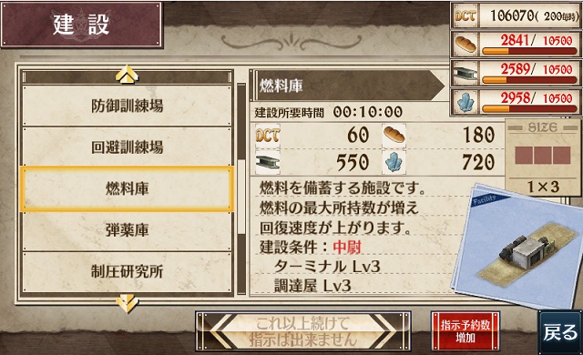 許多設施必須晉升軍階後才能建造,升級中尉後優先建造燃料庫與彈藥庫