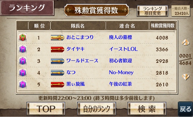 每一項軍事行動都有排名 (ランキング),例如個人制壓點、聯軍制壓點、敵方頭目發現數、敵方頭目擊破數及殊勳賞獲得數,名次越高獲得的獎勵越豐富;戰役結束後個人制壓點總和會轉換成名聲,名聲會影響玩家軍階的晉升;此外,中將以上的軍階採用固定配額制,若沒有持續累積名聲,也會降級至少將。