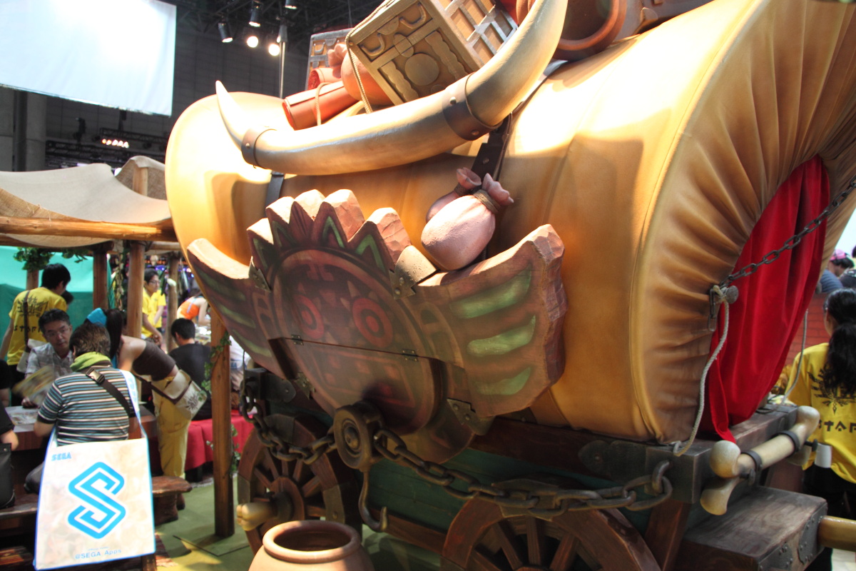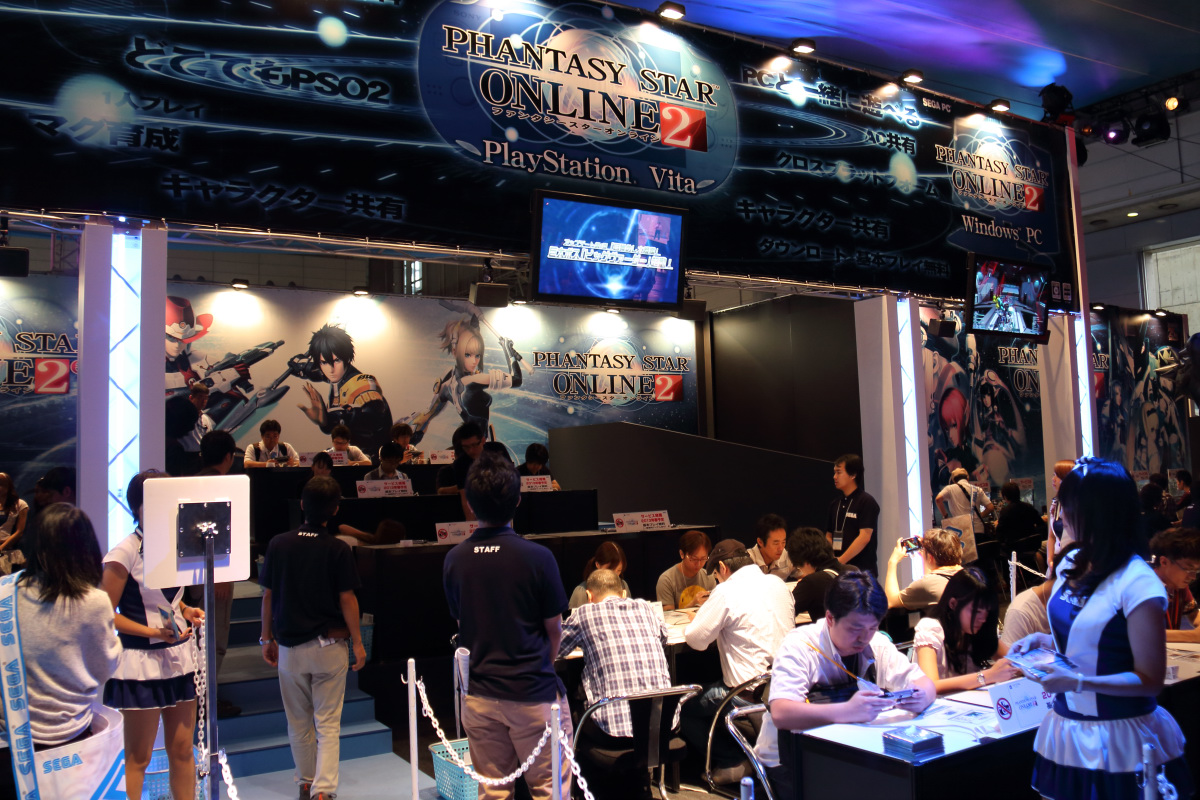 夢幻之星網路版 2 》為主題擺出,除了一定要有的試玩機台之外,還可以看到巨大火山龍充氣模型和超重現遊戲角色的可愛 Cosplayer。不過因為 PS Vita 的初音未來最新作已經推出,所以本次在 SEGA 攤位沒辦法看到人氣正夯的初音身影。