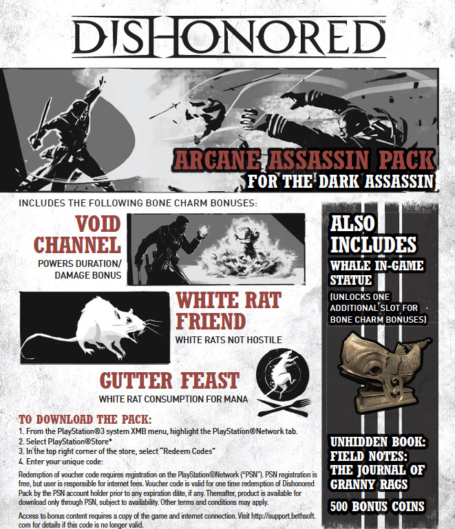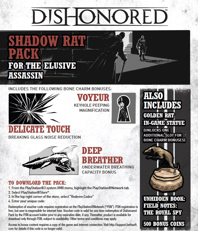本套件包含 3 個無法在遊戲中獲得的技能,讓你成為黑暗中的刺客。虛空通道:使用能力的效果與持久增加。白老鼠朋友:白老鼠不是敵人。盛宴:使用白老鼠技能時獲得法力點數。此外,本套件也包含遊戲中可用的鯨魚雕像,可增加一個主動技能的空位。以及遊戲中的書本「老太太抹布」,和 500 個可用來更換彈藥、裝備與升級的點數。