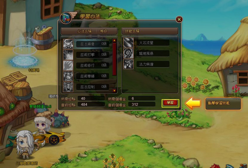 遊戲的技能必須找專屬職業導師才可學習,學習技能時會消耗經驗值以及儲備金,這也是此款遊戲的人物升級設計為經驗值到了卻要自己手動點擊升級的用意。