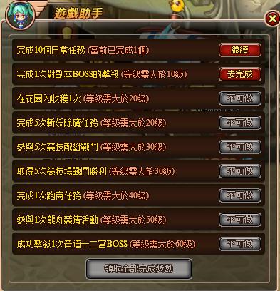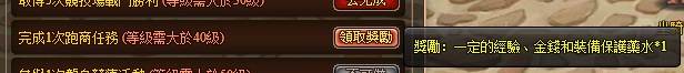 跑商結束之後別忘了點擊上面的遊戲助手,可以再領取經驗跟金錢以及裝備保護藥水的獎勵。