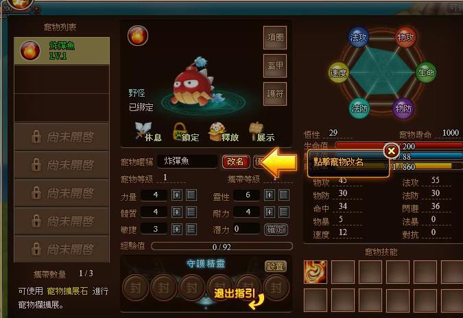 當捕捉到了喜歡的寵物後,還可以在寵物操作面板,幫它取一個喜歡的名字。
