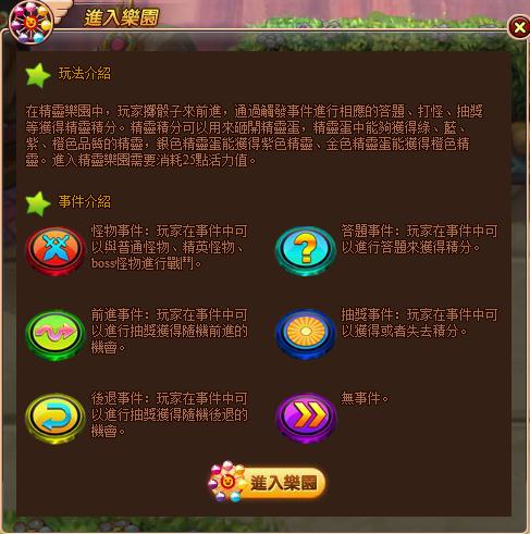 進入精靈樂園除了等級要 40 級之外,還要額外消耗 25 點的活力值,進去之後,就是類似大富翁的模式,採用擲骰子的方式來行走,看走到哪一格就觸發事件,進而累積積分。