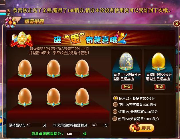 走完全程之後,所獲得的積分就會公告出來,並且在此看到自己獲得的精靈蛋。一般的精靈蛋要敲破需要花 80 積分,在右上角有兩種比較高級的精靈蛋,相對的得到的精靈屬性也較優質。