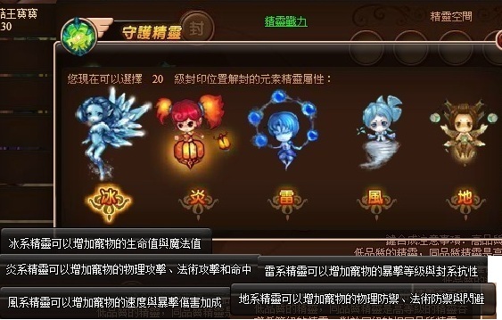 而這裡提醒一下,玩家記得要先解開寵物精靈的封印,當寵物每增加 20 級時都可以解開一個封印,共有 5 種屬性可以選擇,所以寵物 40 級時可以裝備兩個精靈,以此類推。