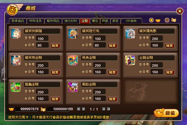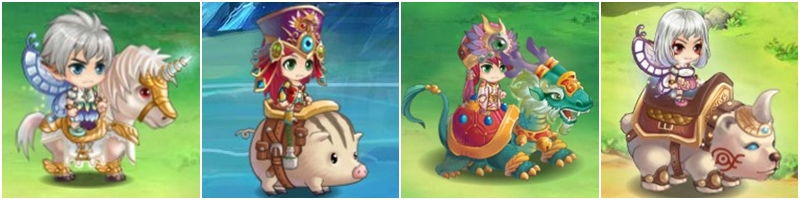 這款遊戲除了時裝之外,座騎的種類也是很多樣。坐騎商人賣的坐騎共有 4 種-豬、熊、獨角獸、陸行鳥,每一隻都只要 100 天寶。