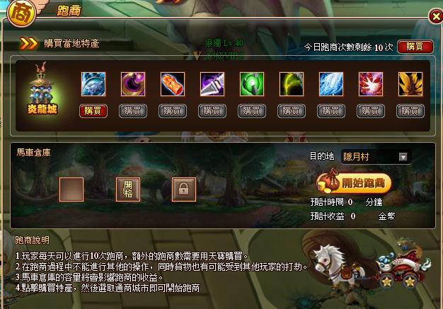 當人物達到了 40 級的時候,就可以進行跑商。跑商必須透過跑商使者 NPC,點擊跑商之後,就會出現你可以購買的特產。