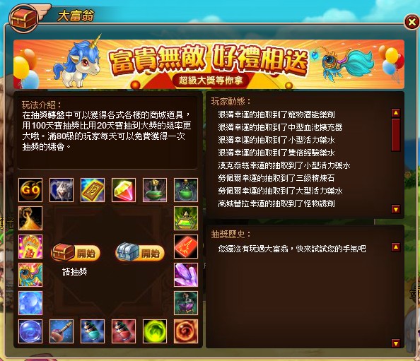 最後,朋友可以玩玩介面上休閒裡面的大富翁,用少量的天寶,就可獲得高價值的寶物,而等級滿 80 級的玩家,每天還有一次的免費體驗機會。