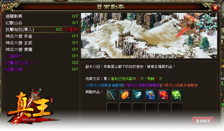 抗擊匈奴副本分為單人和多人副本;只要角色等級大於 37 級 (含 37 級) 就可以參與單人的抗擊匈奴副本,且一天可以進行兩次。如果角色等級大於 41 級 (含 41 級),則可以組好夥伴一起對抗多人的抗擊匈奴副本!隨著人物角色等級的成長,王者們也可以選擇難度更高的副本進行。