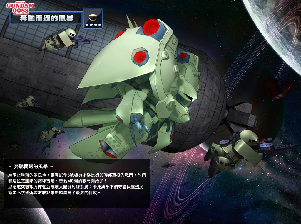 原作故事中鋼彈試作 3 號機典多洛比姆與聯邦軍為阻止殖民地墜落,對迪拉茲艦隊的諾耶吉爾、吉翁機體展開戰鬥,聯邦軍快速突破敵方陣營並成功破壞太陽能射線系統,卡托與部下們守護保護殖民衛星不致墜落並對聯邦軍戰艦展開最終的反擊!