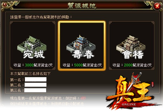 領地爭奪戰,且依照前一、二、三名進行領地選擇,領地選擇只有 10 秒鐘的時間,如果沒有把握時間選擇的話,系統可是會自行幫王者決定您的幫派領地哦!