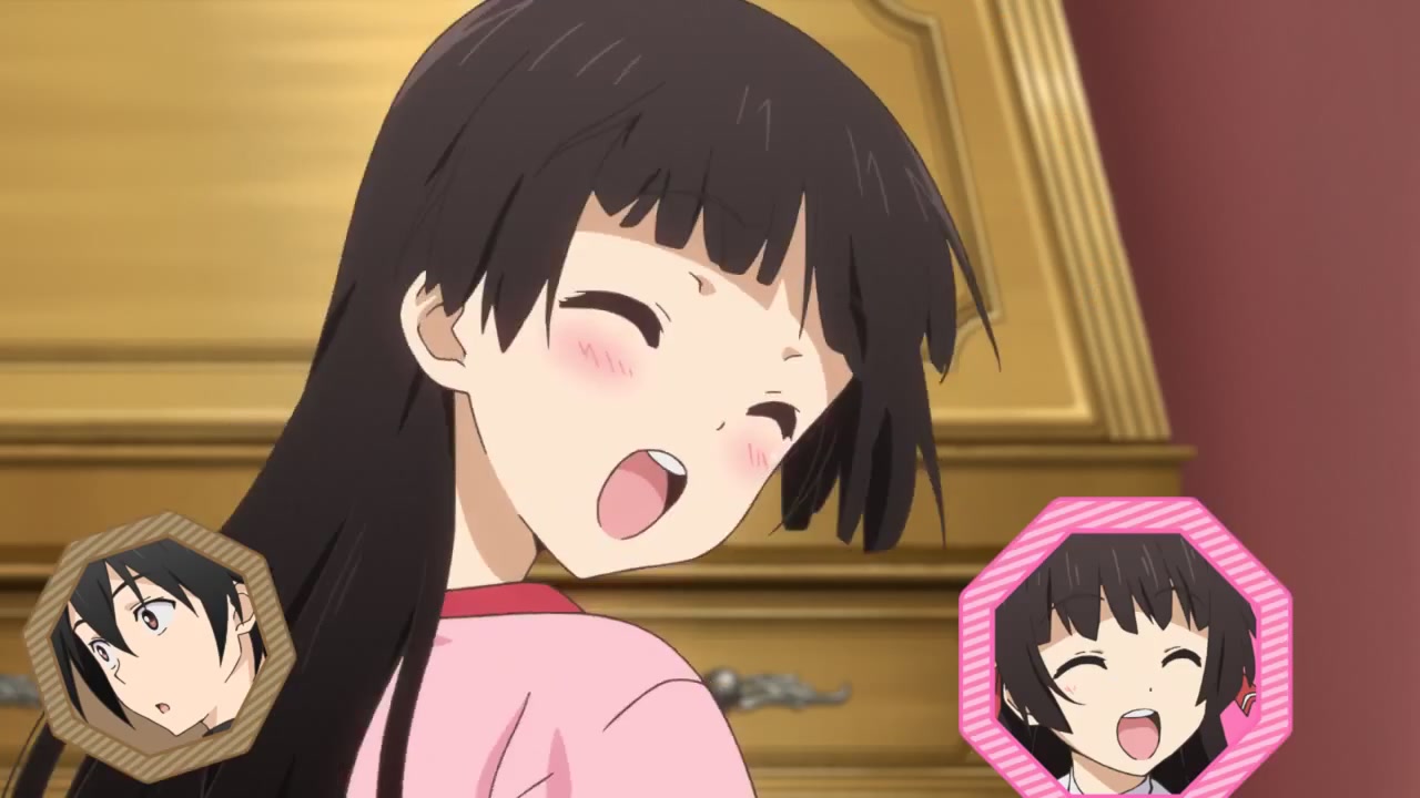 從一開始,表情就非常生動豐富的秋子。身上穿的衣服寫著「I ♥ 妹」