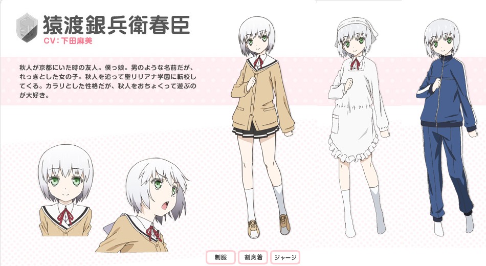 猿渡銀兵衛春臣(CV:下田麻美) 學生會會計,秋人在京都認識的朋友,很會作家事。其實有著與年齡不相襯的興趣…